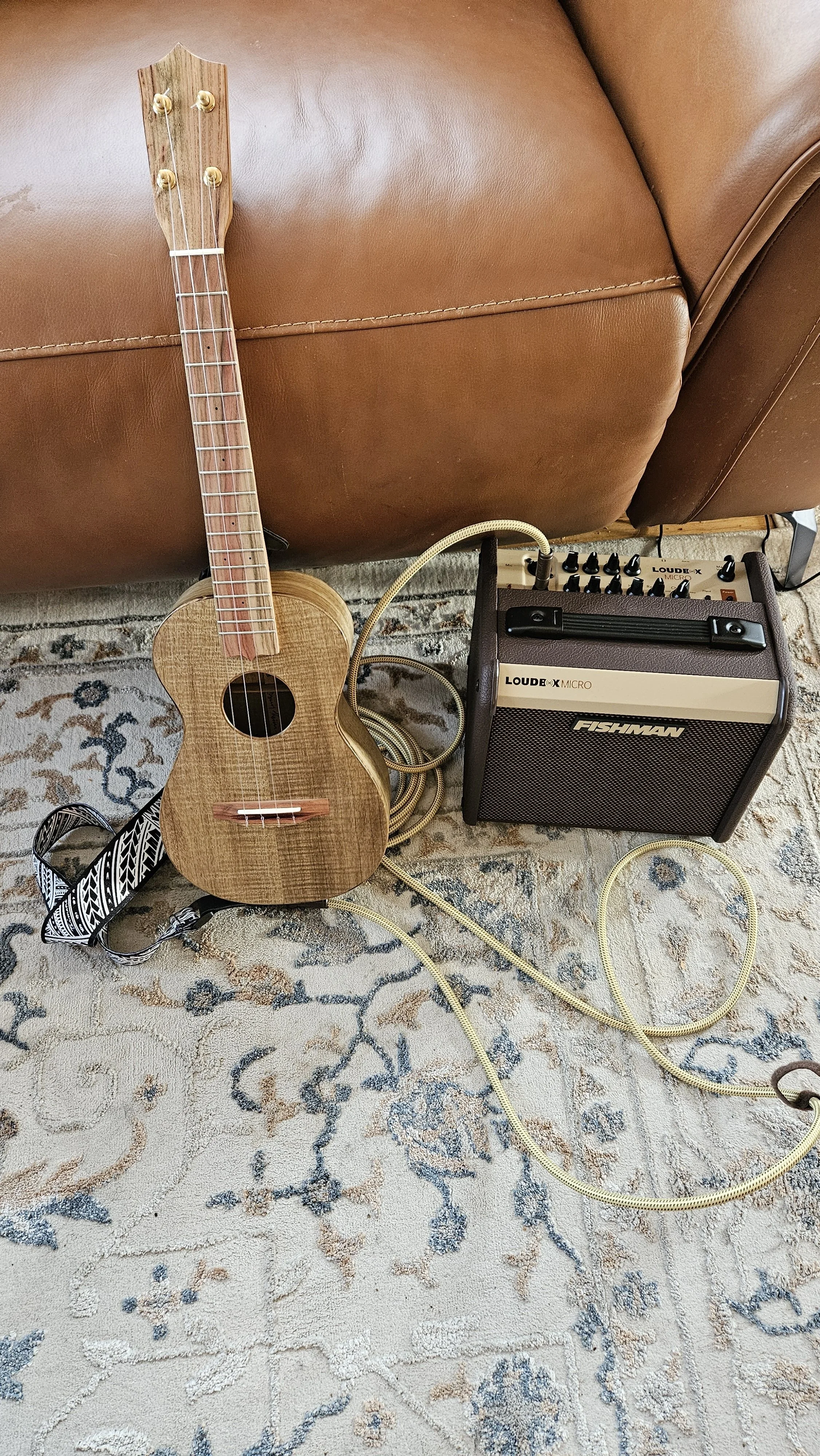 I had bought a Fishman Micro in anticipation of this beauty and Wow! I love the K&K pickup, so clean and clear! The Kala case is so Cool too! I laughed and shouted when I opened the shipping box, “Oh man, it’s a tweed case!”