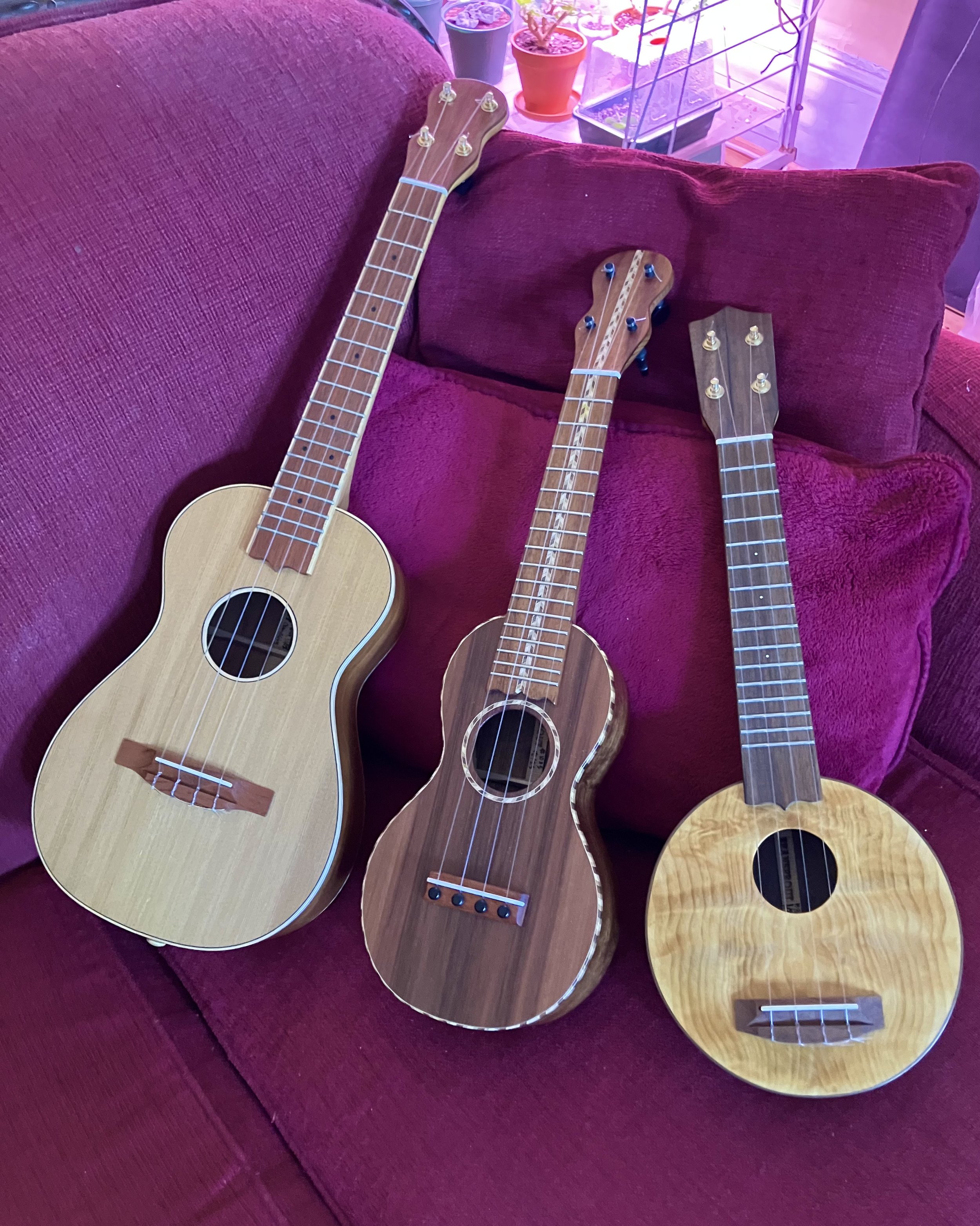 The tenor ukulele seems to be the most popular size in the last ten years or so. It is small enough to still have the sparkle and charm of the little ukulele, but big enough to produce good volume and a deeper tone. I particularly like when we make them with a soft wood top and a hardwood back and sides. In this case, the top is some wavy Port Orford Cedar that comes from the Oregon coast. I salvaged it from the estate of my neighbor, who was a flute maker. The back and sides are some beautiful Walnut from Parkdale, OR. The fretboard/headplate/bridge is some pinkish Pistachio from California orchards. The neck is a piece of white Mahogany that I salvaged from the rebuild it center. It sounds loud, vibrant and rich, with long sustain. Thanks Sylvia!