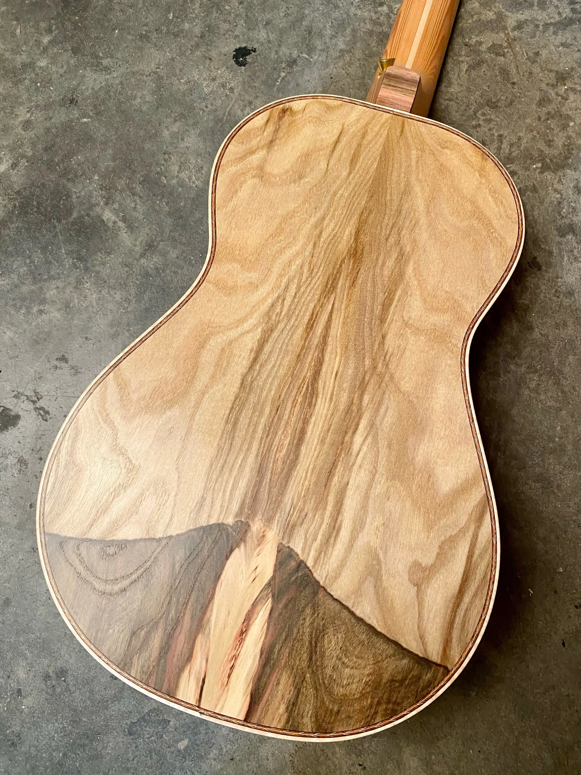 This ukulele is for Ian, who picked wood from my most loyal supplier, woodfromthewest.com. The curly port Orford Cedar top is from the Oregon coast and the pistachio back, sides, fretboard, headplate and bridge are from California orchards. I paired it with a fir neck made from a Portland floor joist that my fried Chris saved from a dumpster. It has a single nail hole in the end of the headstock. The bird’s foot purfling from Gurian adds a dark streak that contrasts well with the curly maple binding. It sounds big, looks unique and is lively to play.