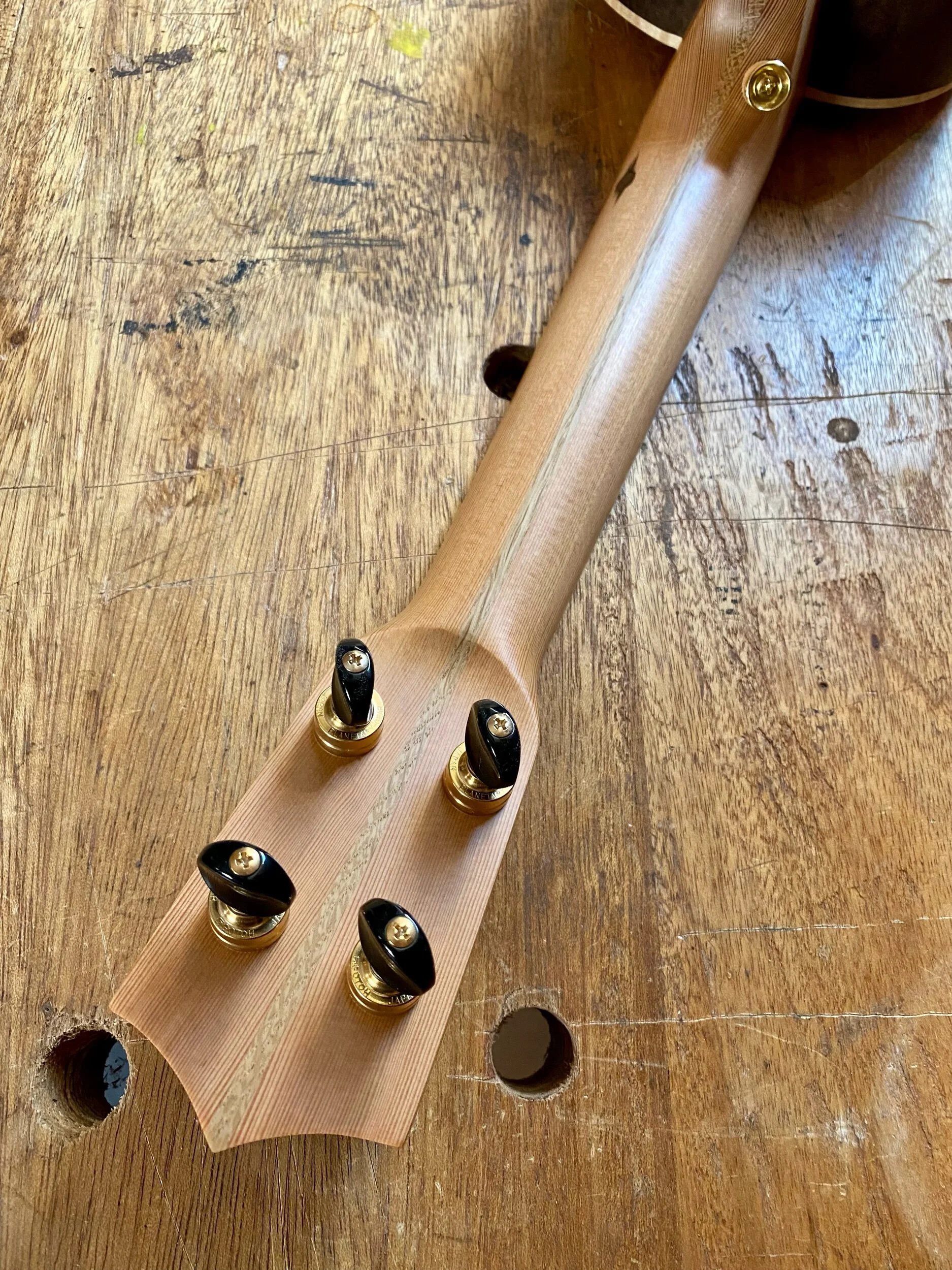 This is a second alto ukulele for Jann, who asked for one with a low fourth string and good playability all the way up the neck. She has been tackling some challenging classical music lately and needs the extra range. I had fun with contrasts on this one, with the light spruce, dark walnut and greenish pistachio all wrapped up in maple binding. It’s loud but rich and sings all the way up the neck, I hope it works for her.