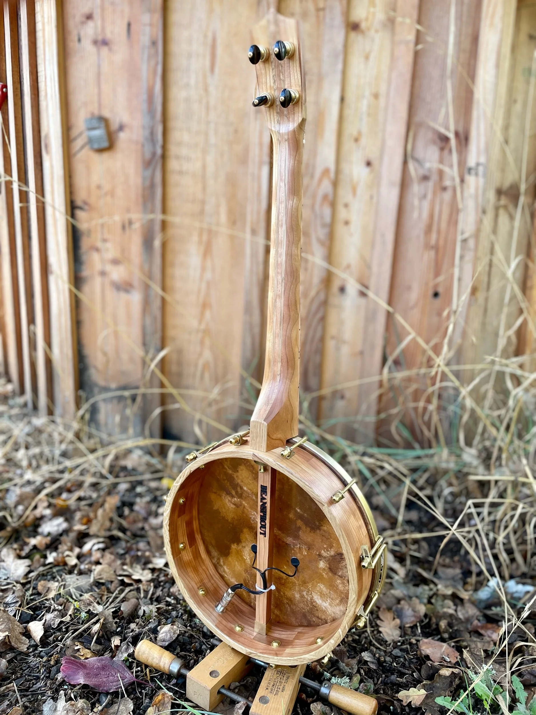This one was very fun for me. We knew the customer wanted Curly Cherry as the main wood, but we weren’t sure on the secondary wood. I was on a walk up the road when I thought of all the Oak barrel staves I had from our neighbors at Hiyu Wine Farm. As I got into the project, I realized we could use some of the Oak that was still stained from the wine! Once it was dressed up like that, the rest of the details followed easily. 11” Cherry block rim with Oak cap. 20” scale length Cherry neck with Oak stripes and Oak fretboard/head plate as well. The Goat skin is stained with Walnut shells from our yard. Arm rest and pickup complete the package.
