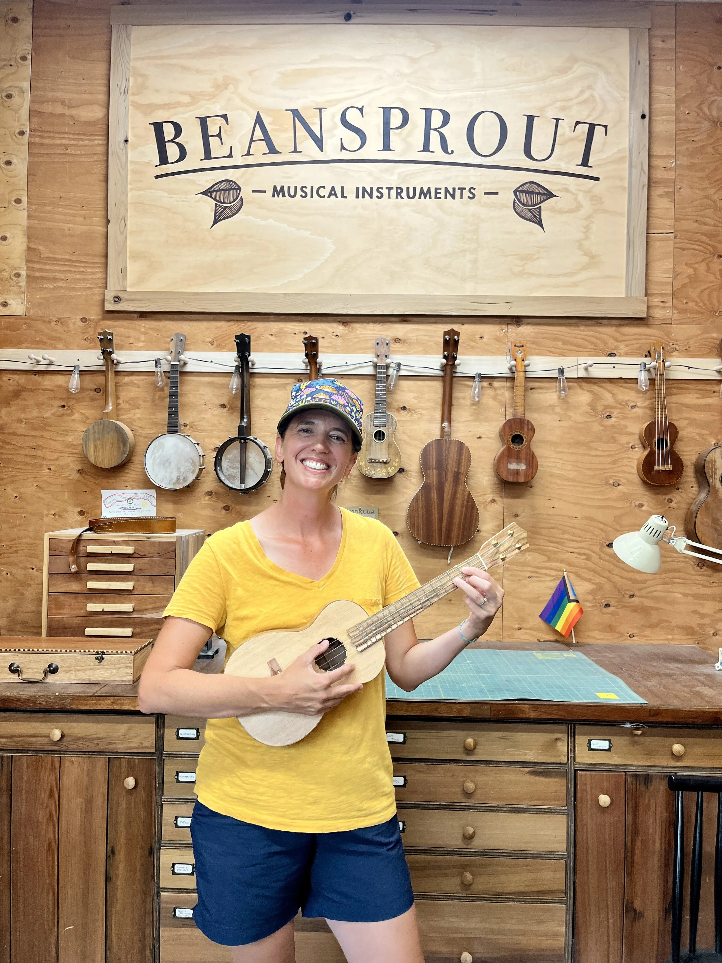 This instrument is for our good friend Erin who wanted a bright and clear sound. She chose Spruce for the top, which is always a winner. For the back and sides, we decided to use the spalted Maple that we harvested from another friend’s house last fall. It was from a big leaf Maple tree that was rotting and too close to the house. By the time I got there, most of it was cut up for fire wood, but we split off some good chunks and dried it. It includes curl, color and some spalting, very nice! Erin also dropped off a chunk of Redwood from her parent’s property in California. Unfortunately, it was too far gone to use for a top, so I cut it up to make an abstract endgraft and heel cap. The thin Maple lines are supposed to look like a tree and like the stairs up to her parent’s house. The neck is salvaged Mahogany from a Portland theater and the rest is Pistachio from California orchards. Overall, I like the loud and sweet sound and the pinkish color palette. A special uke for a special and deserving person!
